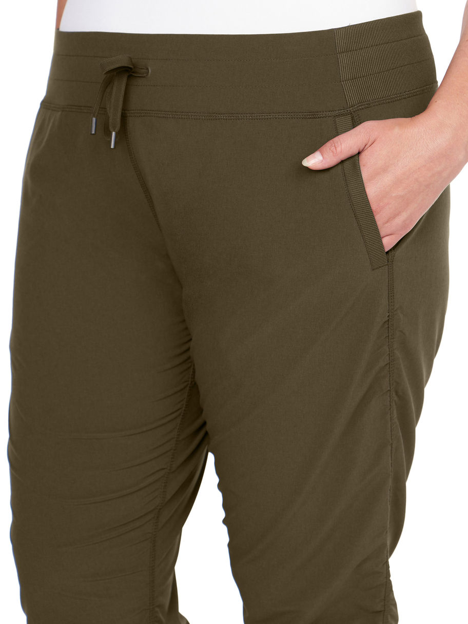 - Black, green, and beige: 91% Repreve™ recycled polyester, 9% spandex